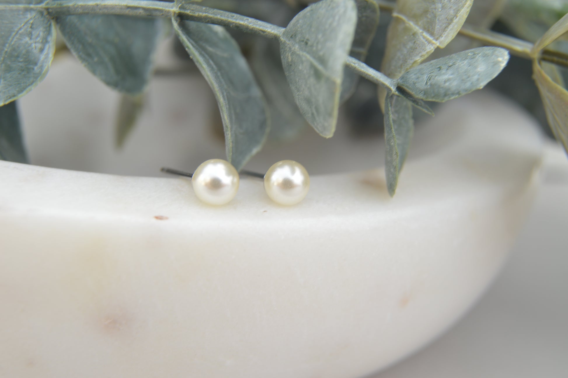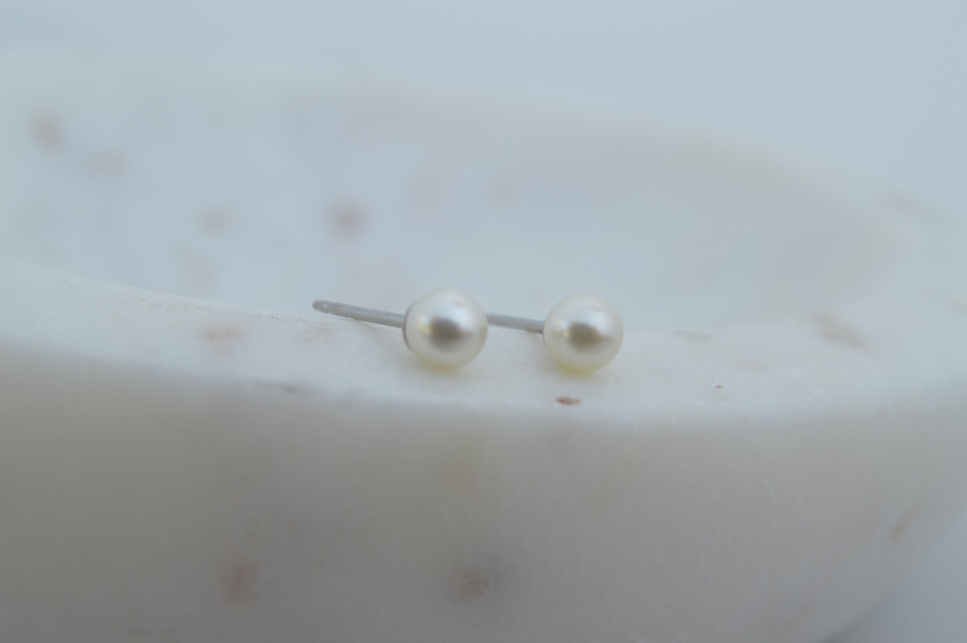 These 4mm pearl studs feature a cream pearl on a surgical-grade stainless steel post. Hypoallergenic and nickel-safe, they’re designed for sensitive ears and everyday comfort.